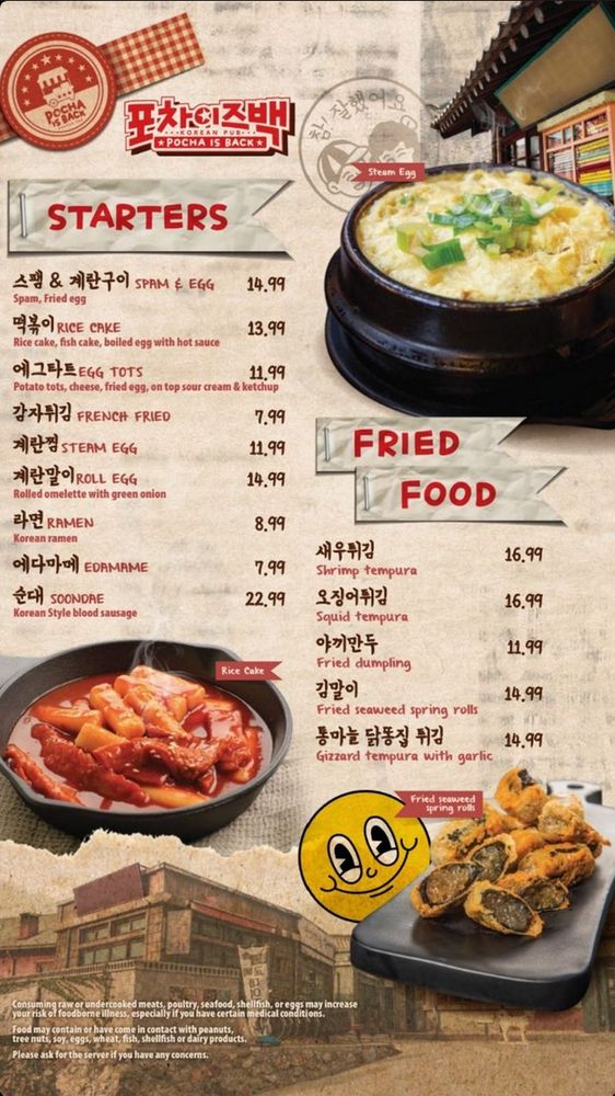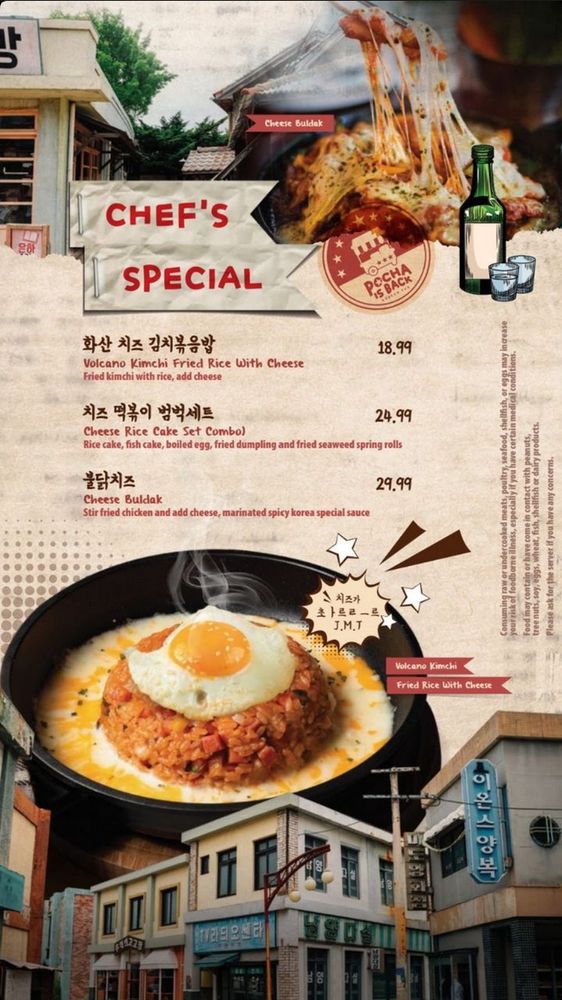 Introducing the menu at POCHA IS BACK, a Korean restaurant located in Austin, TX, where you can enjoy a variety of traditional Korean dishes and drinks. The atmosphere is lively yet not overwhelming, perfect for a casual hangout or a fun night out. Customer reviews rave about the flavorful gamjatang (pork bone soup), kimchi volcano, and cheese buldak. The steamed egg and budae jjigae are also popular choices. The friendly staff and modern interiors add to the overall dining experience. Prices are on the higher side, but portion sizes are generous and perfect for sharing. Whether you're looking for a late-night spot after a UT football game or a place to relax with friends over beers and soju, POCHA IS BACK is a must-try destination in Austin.